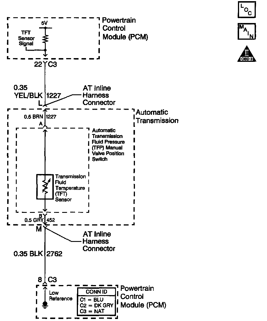 The automatic Transmission Fluid Temperature (TFT) sensor is part of the automatic Transmission Fluid Pressure (TFP) manual valve position switch. The TFT sensor is a resistor, or thermistor, which changes value based on temperature. The sensor has a negative-temperature coefficient. This means that as the temperature increases, the resistance decreases, and as the temperature decreases, the resistance increases. The Powertrain Control Module (PCM) supplies a 5-volt reference signal to the sensor on the TFT sensor signal circuit and measures the voltage drop in the circuit. When the transmission fluid is cold, the sensor resistance is high and the PCM detects high signal voltage. As the fluid temperature warms to a normal operating temperature, the resistance becomes less and the signal voltage decreases. The PCM uses this information to control shift quality and torque converter clutch apply.
