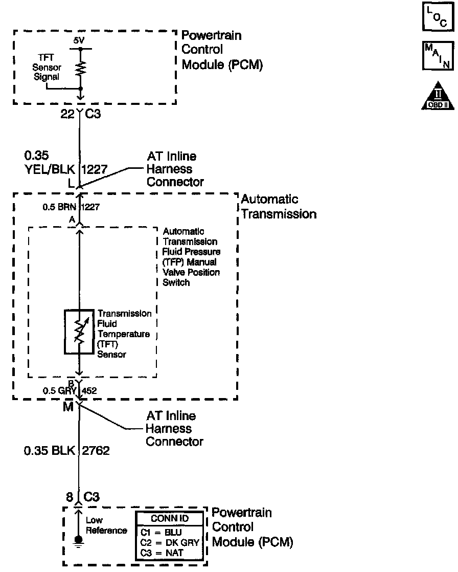 The automatic Transmission Fluid Temperature (TFT) sensor is part of the automatic Transmission Fluid Pressure (TFP) manual valve position switch. The TFT sensor is a resistor, or thermistor, which changes value based on temperature. The sensor has a negative-temperature coefficient. This means that as the temperature increases, the resistance decreases, and as the temperature decreases, the resistance increases. The Powertrain Control Module (PCM) supplies a 5-volt reference signal to the sensor on the TFT sensor signal circuit and measures the voltage drop in the circuit. When the transmission fluid is cold, the sensor resistance is high and the PCM detects high signal voltage. As the fluid temperature warms to a normal operating temperature, the resistance becomes less and the signal voltage decreases. The PCM uses this information to control shift quality and torque converter clutch apply.