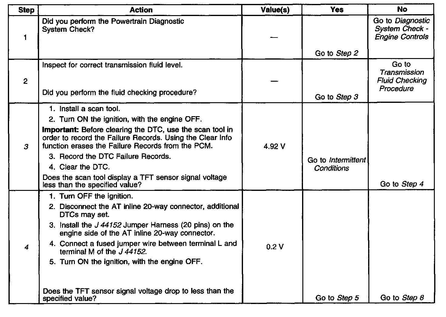 4. This step simulates a TFT sensor DTC P0712. If the PCM recognizes low signal voltage, high temperature, the PCM and wiring are functioning normally.