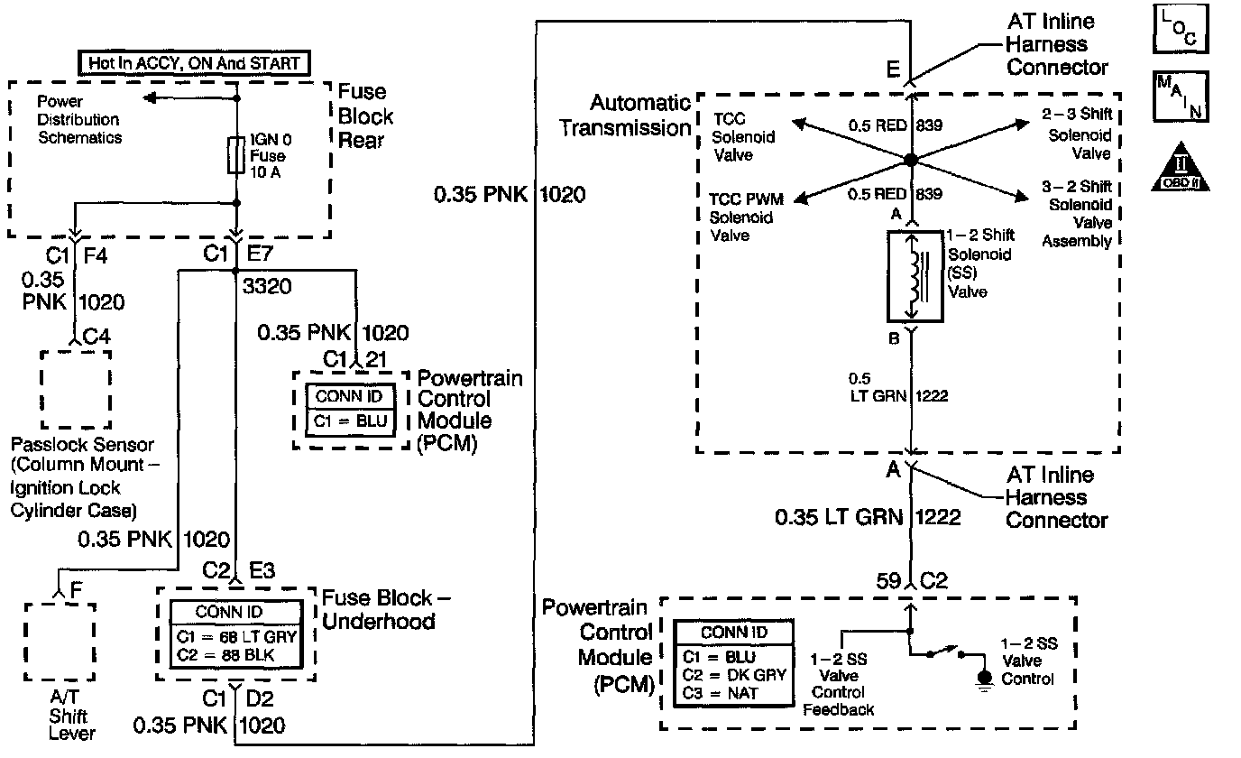 The 1-2 Shift Solenoid (SS) valve controls the fluid flow acting on the 1-2 and 3-4 shift valves. The solenoid is a normally-open exhaust valve. With the 2-3 SS valve, the 1-2SS valve allows four different shifting combinations. The solenoid attaches to the control valve body within the transmission. The 1-2 SS valve receives ignition voltage through the OFF/ON/CRANK voltage circuit. The Powertrain Control Module (PCM) controls the solenoid by providing the ground path on the 1-2 SS valve control circuit.