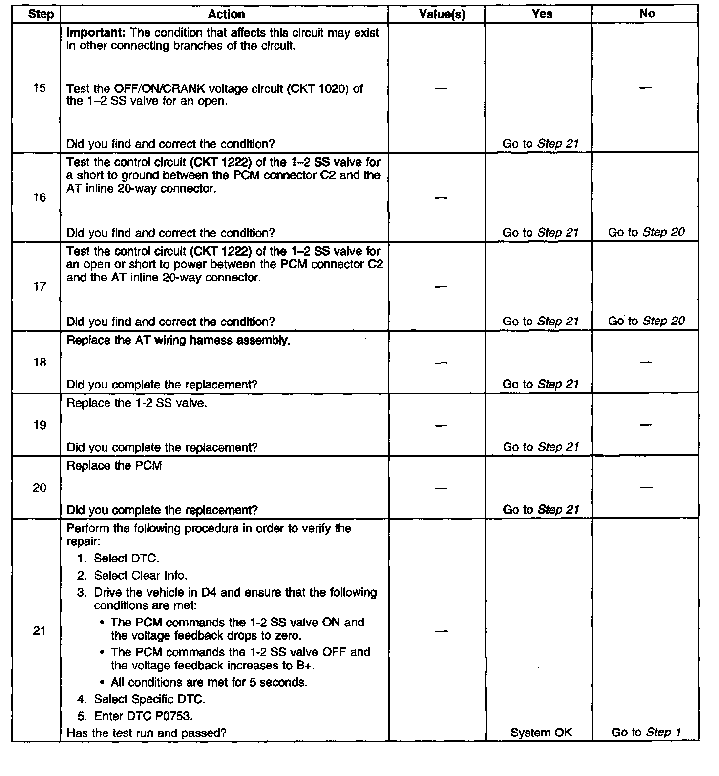 When the PCM detects a continuous open, short to ground or short to power in the 1-2SS valve circuit, then DTC P0753 sets. DTC P0753 is a type B DTC.
