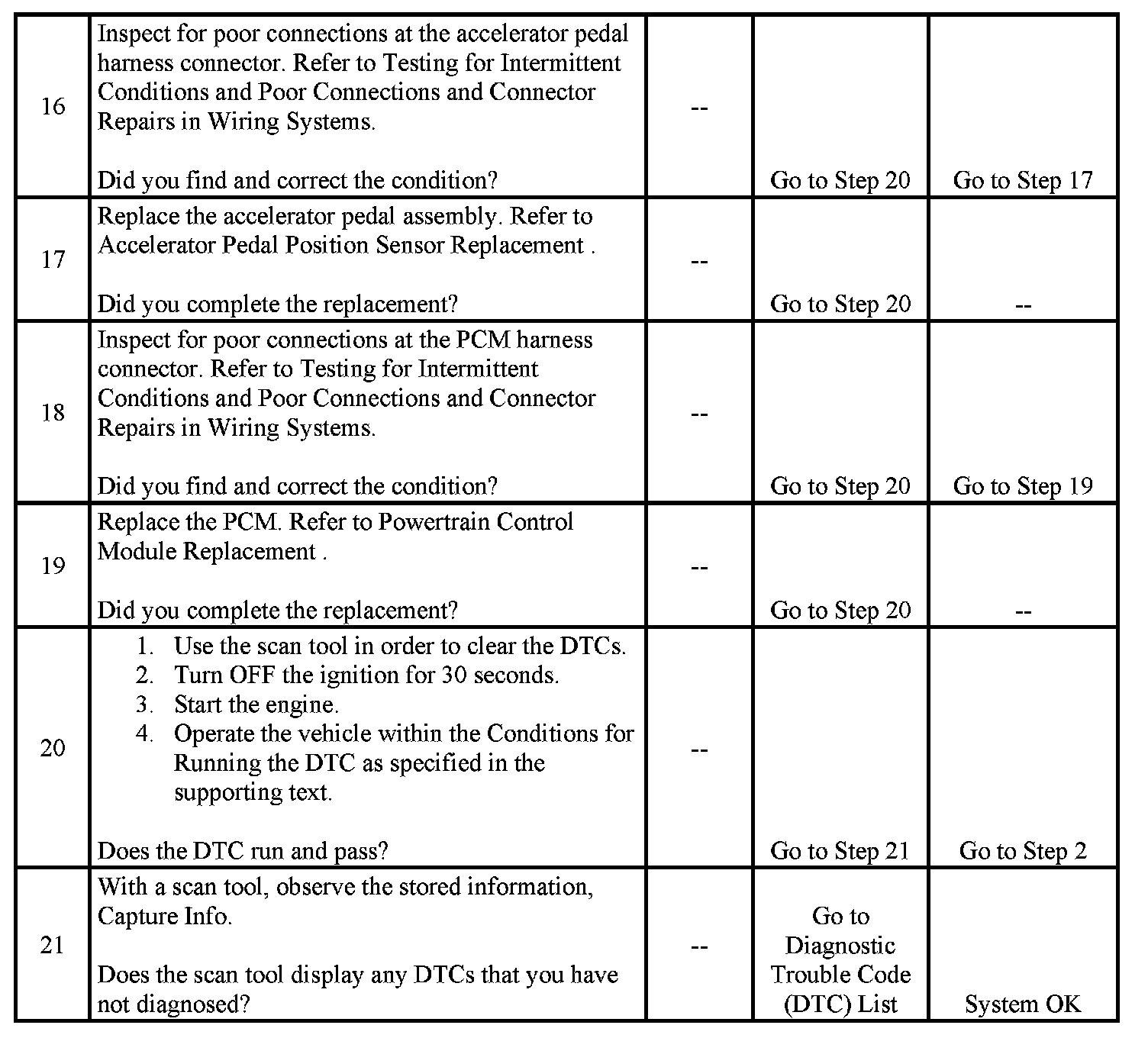 This provides the powertrain control module (PCM) with a signal voltage proportional to accelerator pedal movement. The APP sensor 1 signal voltage at rest position is near the low reference and increases as the pedal is actuated. The APP sensor 2 signal voltage at rest position is near the 5-volt reference and decreases as the pedal is actuated. When APP sensor 1 signal voltage is not within the predicted range, this code sets.