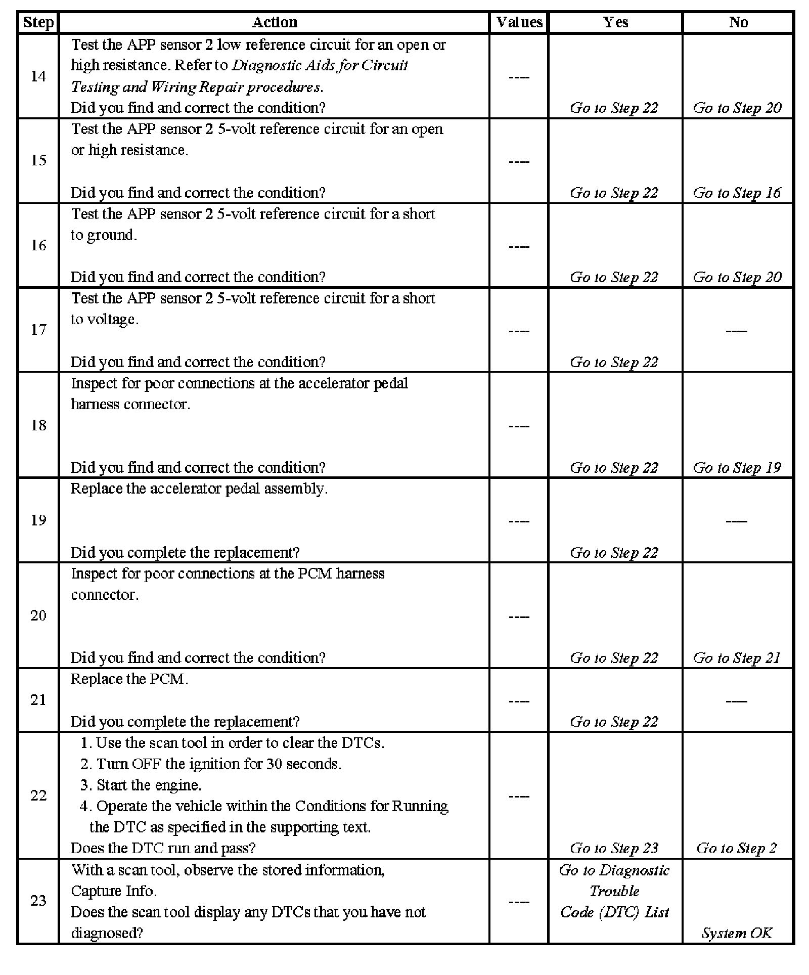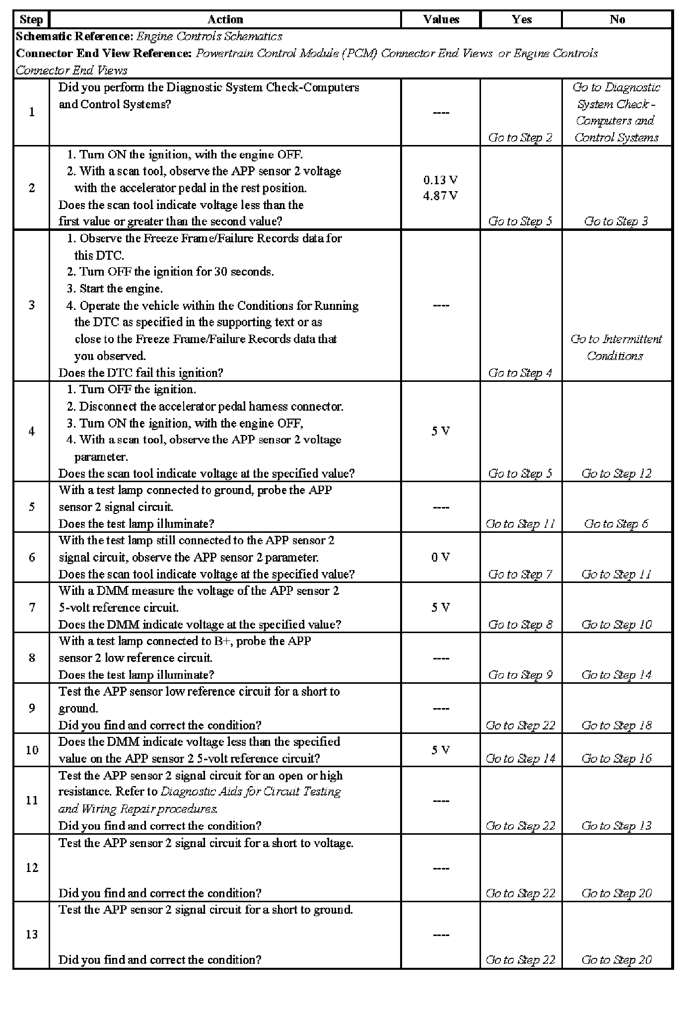 This provides the powertrain control module (PCM) with a signal voltage proportional to accelerator pedal movement. The APP sensor 1 signal voltage at rest position is near the low reference and increases as the pedal is actuated. The APP sensor 2 signal voltage at rest position is near the 5-volt reference and decreases as the pedal is actuated. When APP sensor 2 signal voltage is not within the predicted range, this code sets.