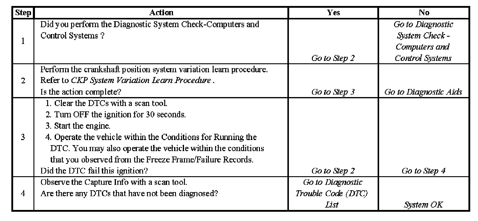 The crankshaft position system variation compensating values are stored in PCM memory after a learn procedure has been performed. If the actual crankshaft position variation is not within the crankshaft position system variation compensating values stored in the PCM, DTC P0300 may set.
