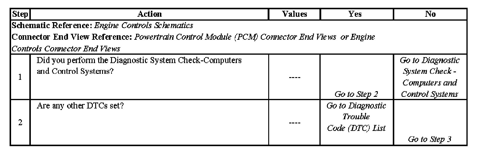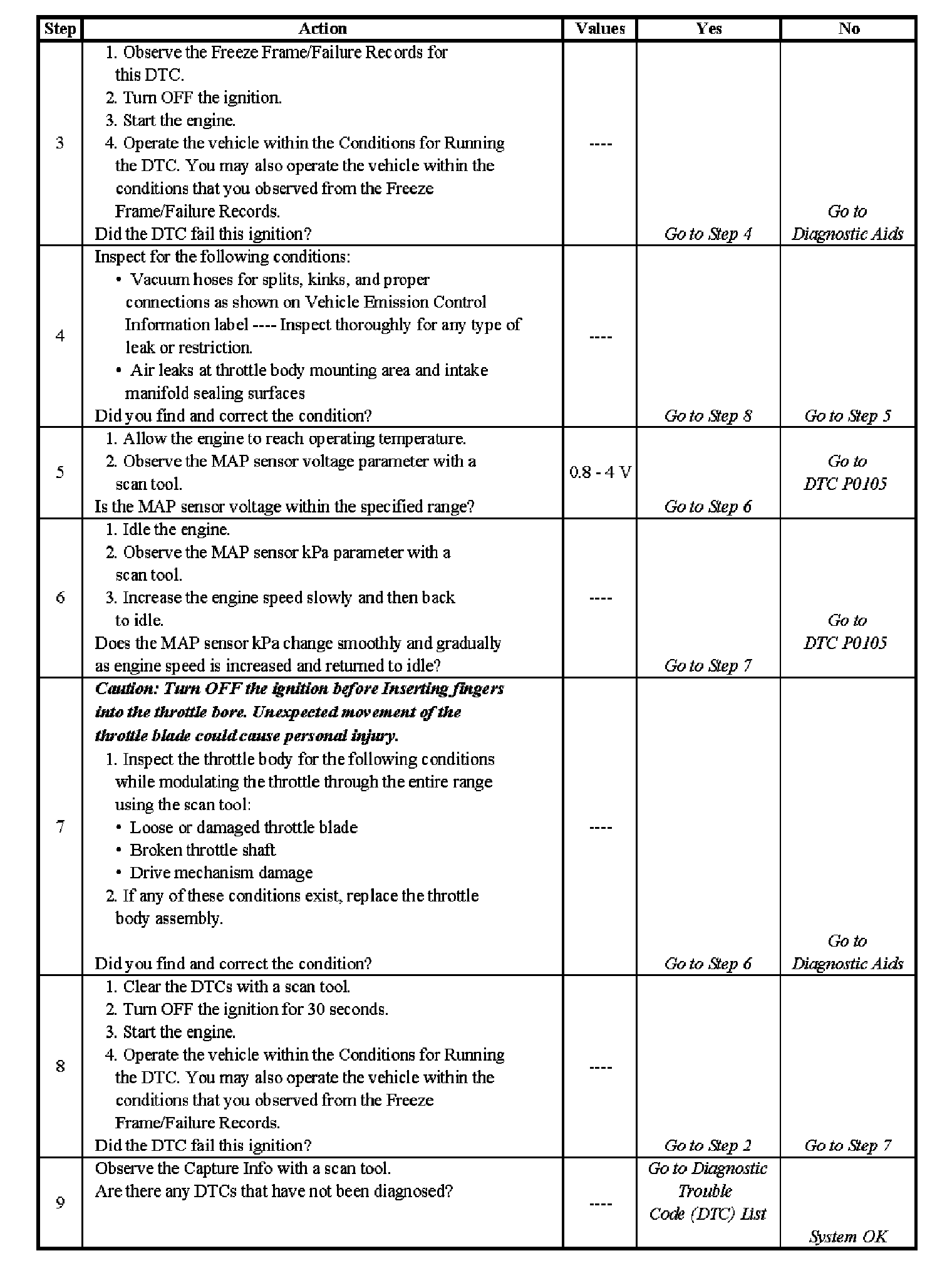The numbers below refer to the step numbers on the diagnostic table.