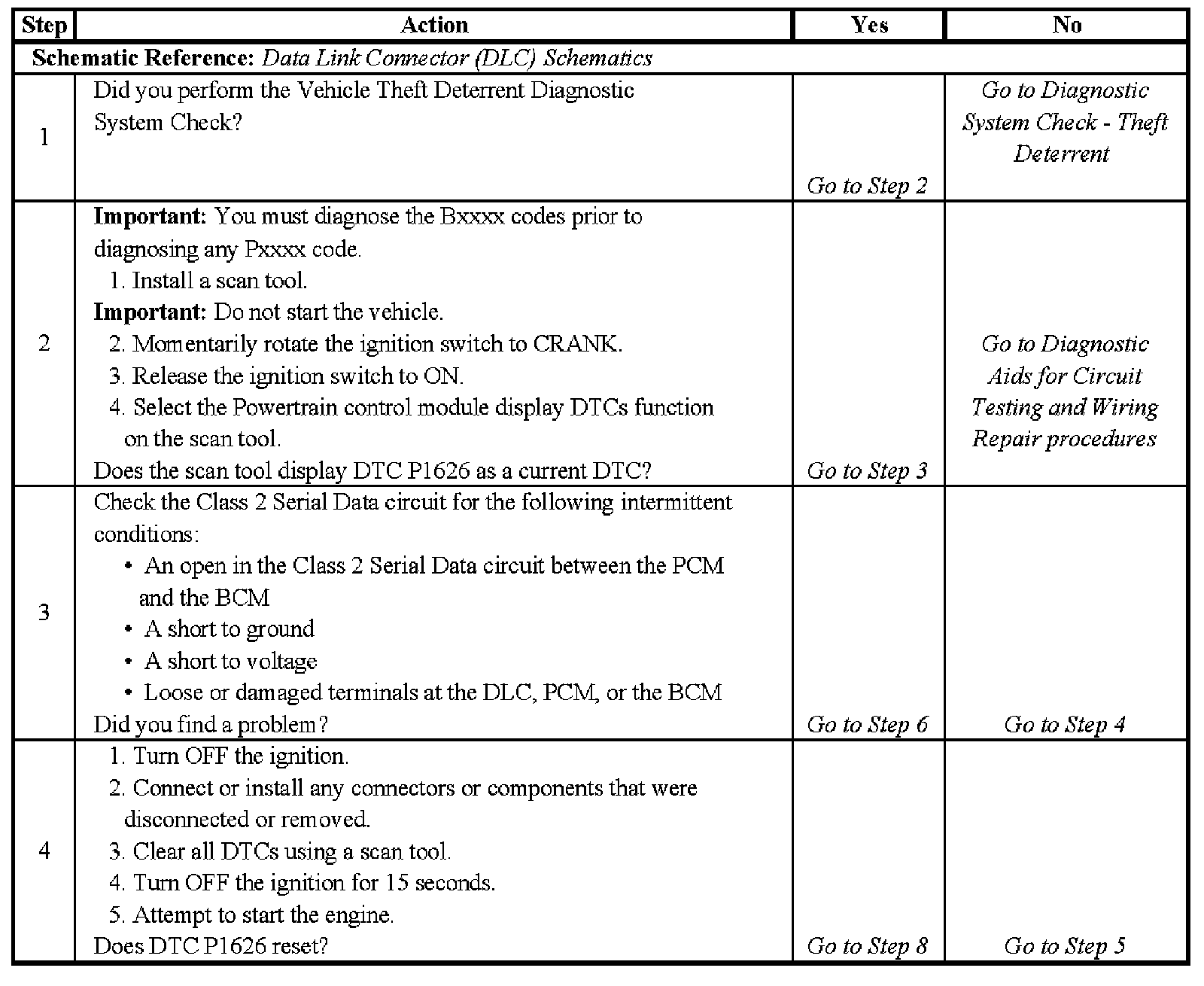 ^ If the Class 2 Serial Data circuit is shorted to ground or shorted to voltage, then all systems connected to the serial data circuit will not be able to communicate properly. Systems capable of storing loss of communications DTCs, or the DTCs with the letter "U" as a prefix, will have these codes stored in their memory. If a DTC U1192 is stored in the PCM memory along with the P1626, then a fault occurred at some point after the PCM received the correct password. The BCM must also be checked for intermittent operation due to a loss of power or ground to the module itself. After repairing the cause of DTC 1626, clear all DTCs from the systems capable of storing this DTC and DTC U1192.