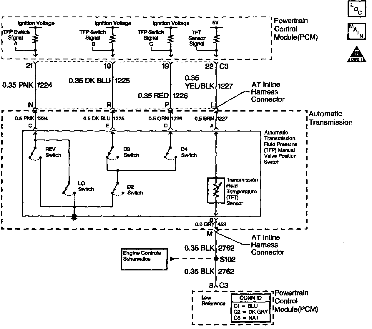 The automatic Transmission Fluid Pressure (TFP) manual valve position switch consists of five pressure switches, two normally-closed and three normally-open, and a Transmission Fluid Temperature (TFT) sensor combined into one unit. The combined unit mounts on the valve body. The Powertrain Control Module (PCM) supplies ignition voltage for each range signal. By grounding one or more of these circuits through various combinations of the pressure switches, the PCM detects which manual valve position you select. The PCM compares the actual voltage combination of the switches to a TFP manual valve position switch combination chart stored in memory. The TFP manual valve position switch cannot distinguish between PARK and NEUTRAL because the monitored valve body pressures are identical. With the engine OFF and the ignition switch in the ON position, the TFP manual valve position switch indicates PARK/NEUTRAL. Disconnecting the AT inline 20-way connector removes the ground potential for the three range signals to the PCM. In this case, with the engine OFF, and the ignition switch in the ON position, D2 will be indicated.