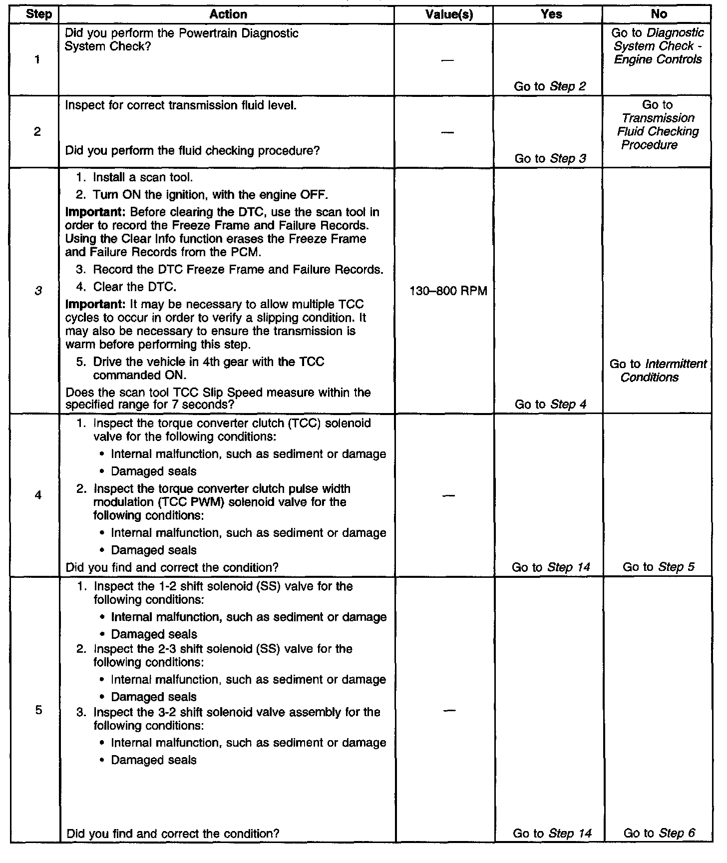 ^ If the TCC is commanded ON for 5 seconds, the TCC is at 40 percent duty cycle for 5 seconds, the TP angle is 20-99 percent and the transmission slip counter has incremented to either 1 or 2, out of 3 to increment the fail counter for the current ignition cycle, then the following slip conditions and actions may increment the fail counter for the current ignition cycle: