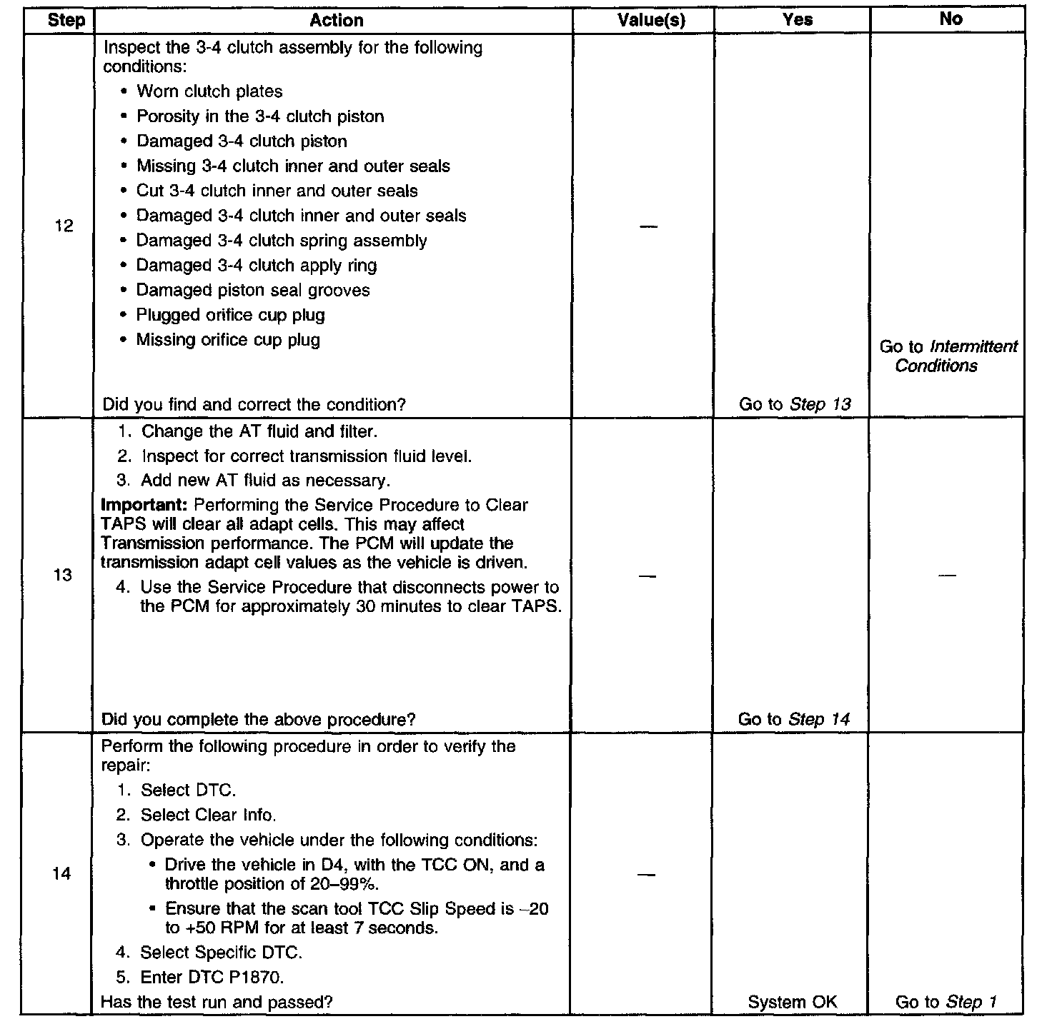 When the PCM detects excessive TCC slip when the TCC should be engaged, then DTC P1870 sets. DTC P1870 is a type B DTC.