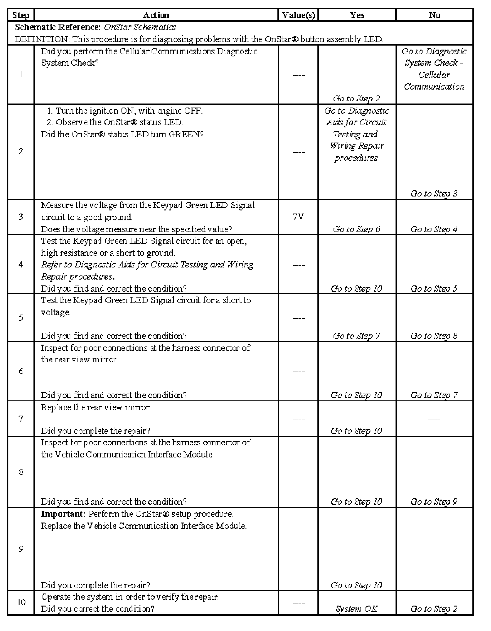 TEST DESCRIPTIONOnStar Button LED Inoperative - Steps 1-10:
