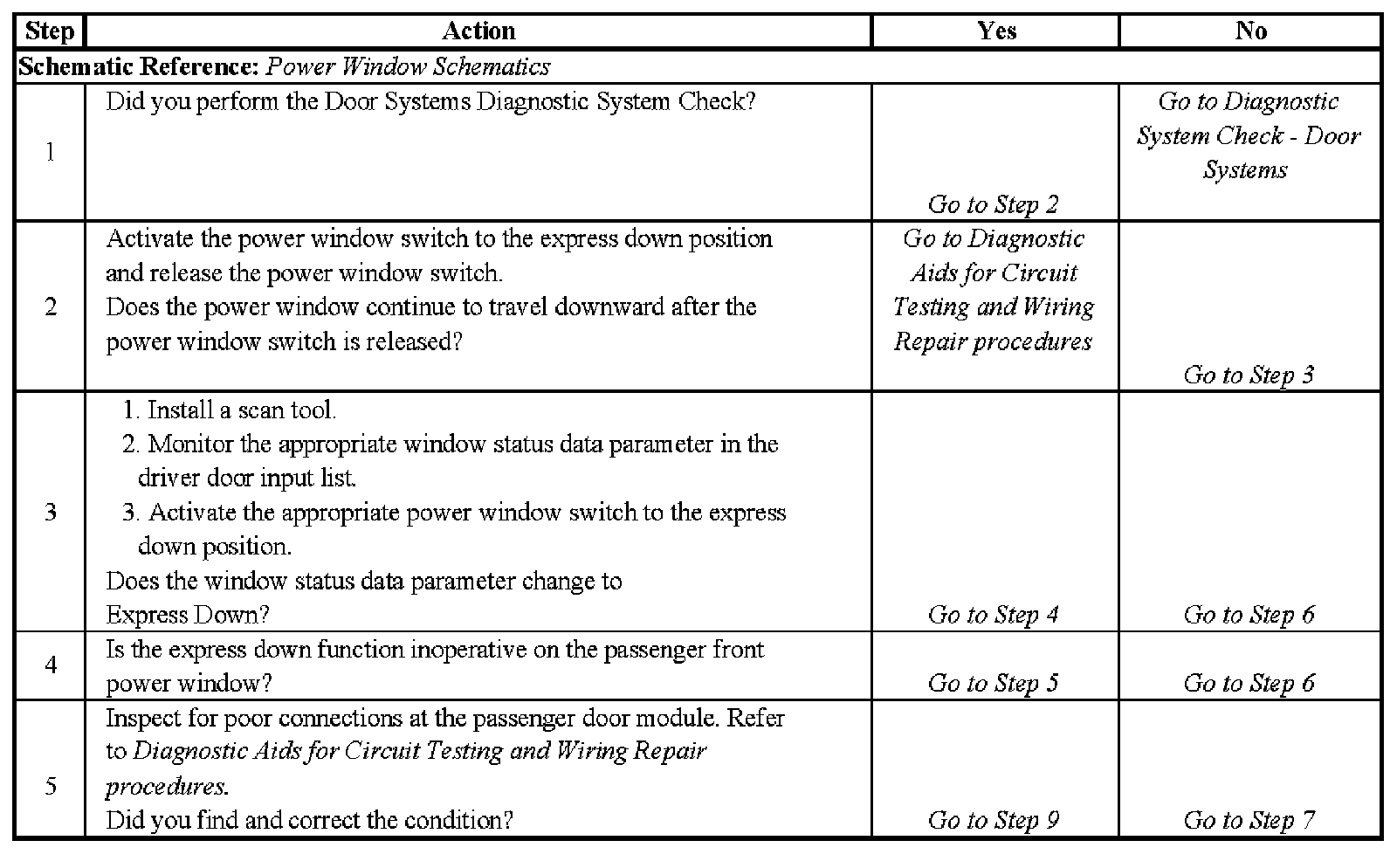 Power Windows Inoperative - Express Down Function - Steps 1-5: