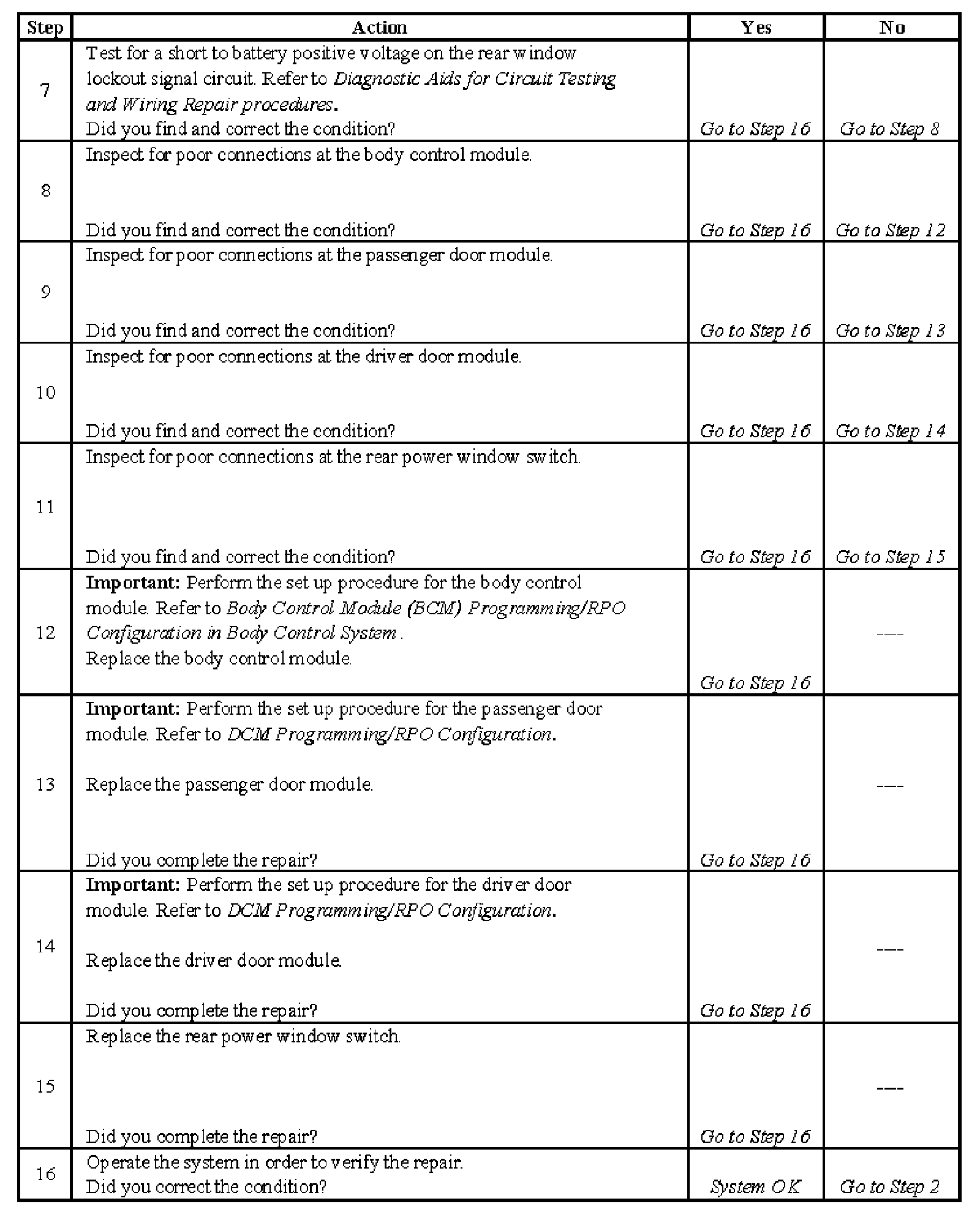 Power Windows Inoperative - Lockout Function - Steps 7-16:
