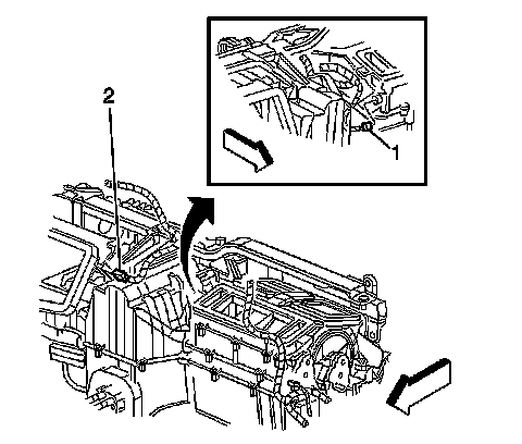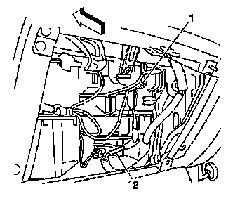 24. Disconnect the headliner harness electrical connector (1) and diversity antenna coax cable connector (2) located near the HVAC evaporator blower motor.