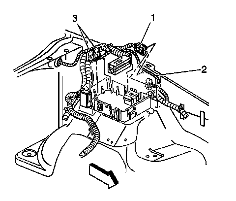 46. Disconnect the 2 IP harness two-way electrical connectors (3) from the underhood junction block base.