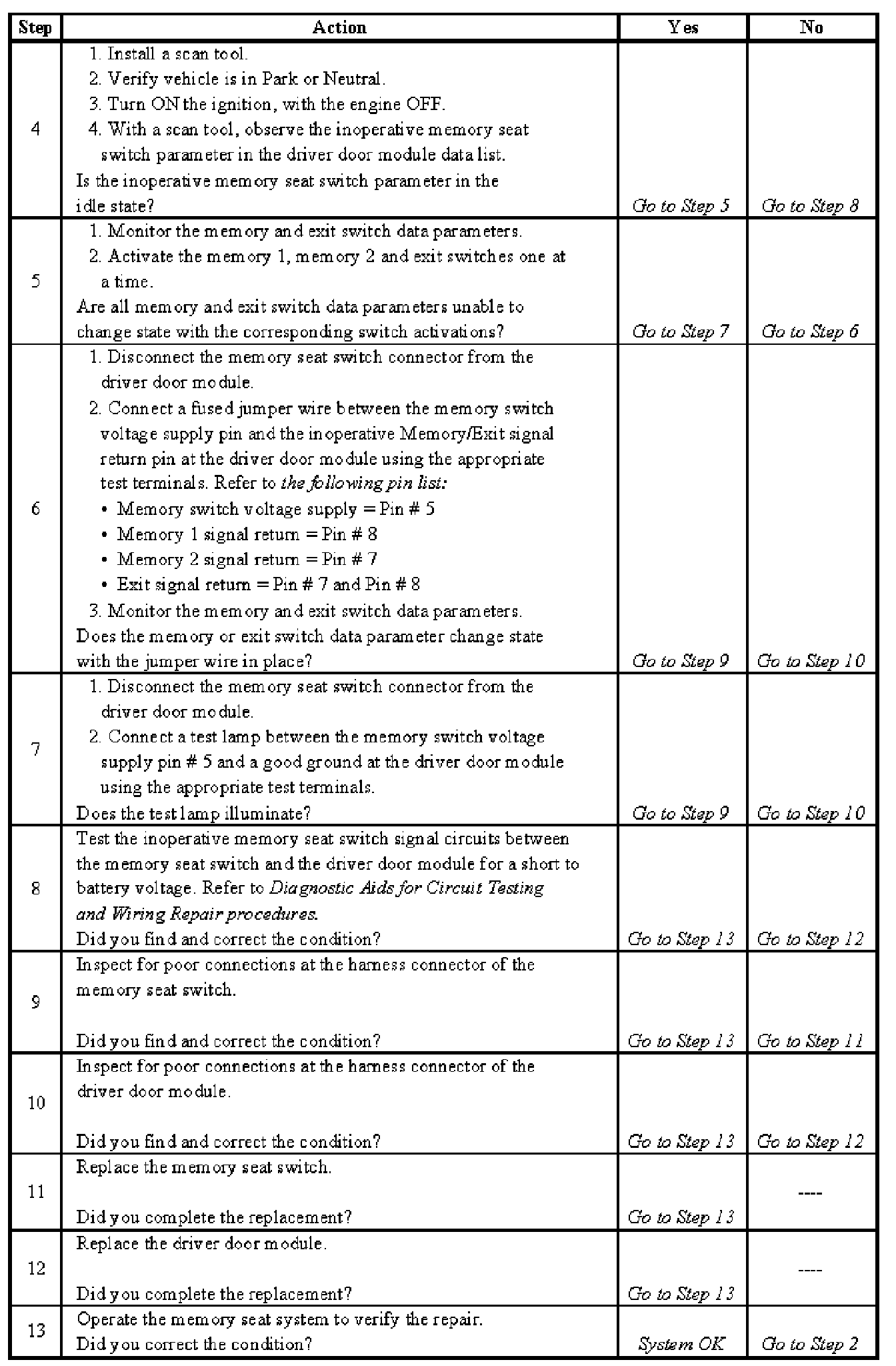 Memory Seat Feature Inoperative - Steps 4-13: