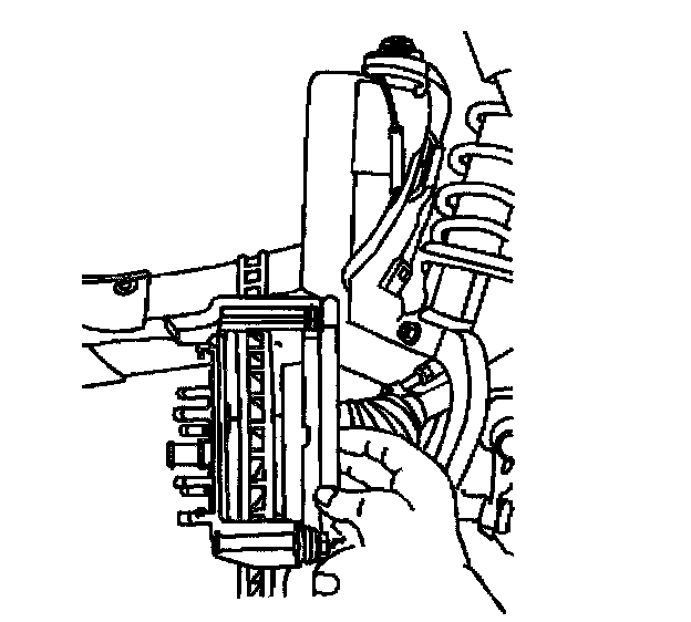 Notice: Support the brake caliper with heavy mechanic's wire, or equivalent, whenever it is separated from it's mount and the hydraulic flexible brake hose is still connected. Failure to support the caliper in this manner will cause the flexible brake hose to bear the weight of the caliper, which may cause damage to the brake hose and in turn may cause a brake fluid leak.