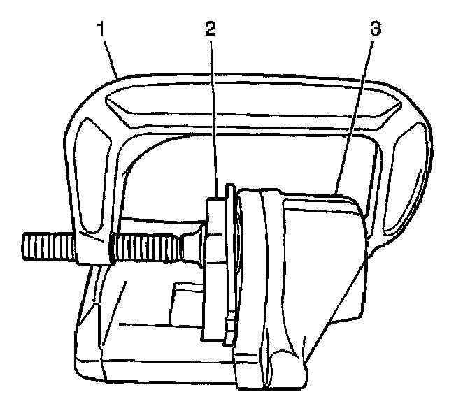 ^ For single piston caliper applications, insert a discarded inner brake pad (2) or block of wood in front of the piston. Using a large C-clamp (1) installed over the body of the caliper (3) and against the brake pad or block of wood, slowly bottom the piston in the bore.