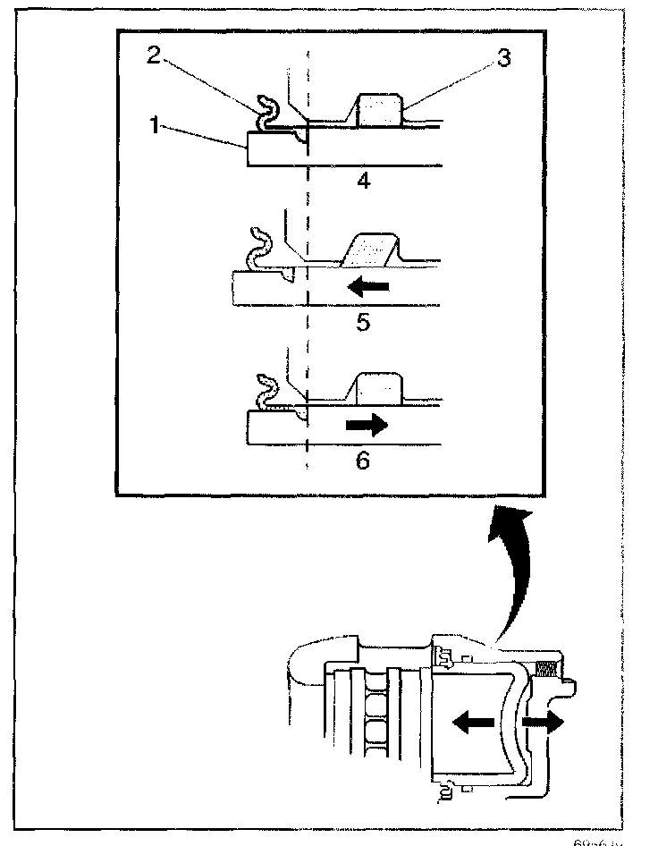 3. While the brake system is at rest (4), observe the position of the caliper piston (1) in relation to the caliper housing.