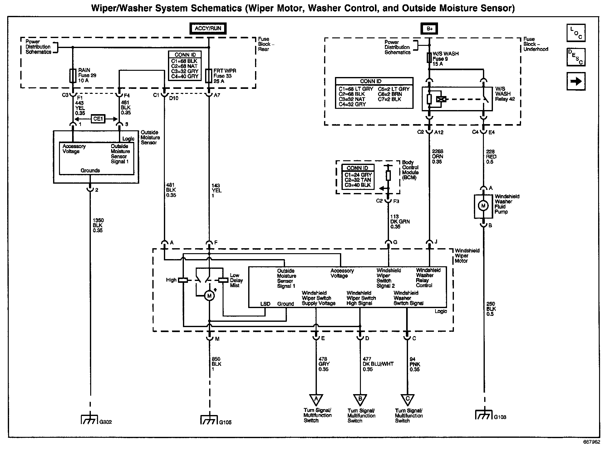 Wiper/Washer System Schematics: Wiper Motor, Washer Control, And Outside Moisture Sensor: