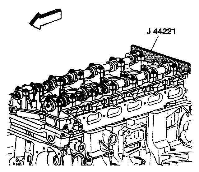 1. Install J 44221 with the camshaft flats up and the number 1 cylinder at top dead center.