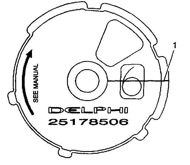 2. To perform an on-vehicle test, scribe or draw a line (1) on the camshaft position actuator, flush with the head, in the full advanced position. See arrow on the camshaft position actuator. With the engine at TDC on #1 cylinder, the wording should be level.
