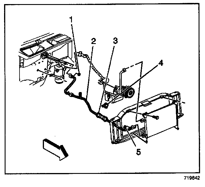 2. Install the A/C refrigerant filter (3) to the evaporator tube (2) with the flow arrow pointing towards the evaporator.