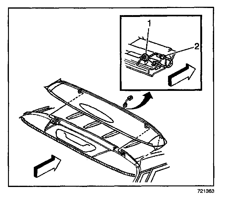 7. Attach the rear portion of the headliner to the roof panel, by seating the 2 headliner retaining pins.