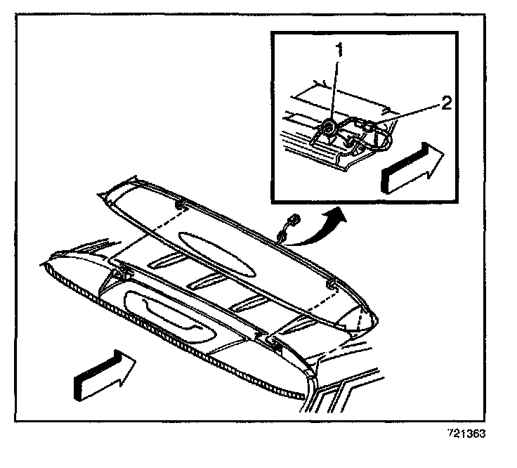 1. Install the high mount stoplamp to the lift gate window reveal molding, ensuring the center retaining tab is fully seated.