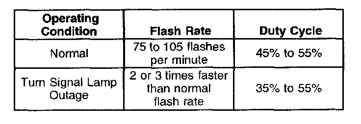 The smart flasher (GMSF) is an automotive flasher designed to accept turn, hazard, and brake inputs. The GMSF will provide corresponding outputs to the exterior lamps and instrument panel turn signal indicator lamps. This lighting system has dedicated lamps for the turn/hazard functions and dedicated lamps for the brake function. The system incorporates the use of flash rates for diagnostics. The flash rate is a calculation of the number of flashes that occur within a 60 second period. This system uses a percentage of on-time to off-time called duty cycle. For the bulb outage condition, the indicator of the vehicle side on which the outage occurs shall assume bulb outage flash rate mode. The opposite side indicator will assume the normal flash rate mode for an input from the non bulb outage side of the vehicle. Hazard warning lamp outage will maintain a normal flash rate as long as two or more exterior signaling lamps are functional. During all modes of operation, the IPC will receive the same flash rates and duty cycles that the exterior lamps receive. The IPC will then control the indicators in the cluster. The vehicle operator will be provided with an audible and visual indication of the flasher operation. The table has flash rates and duty cycles.