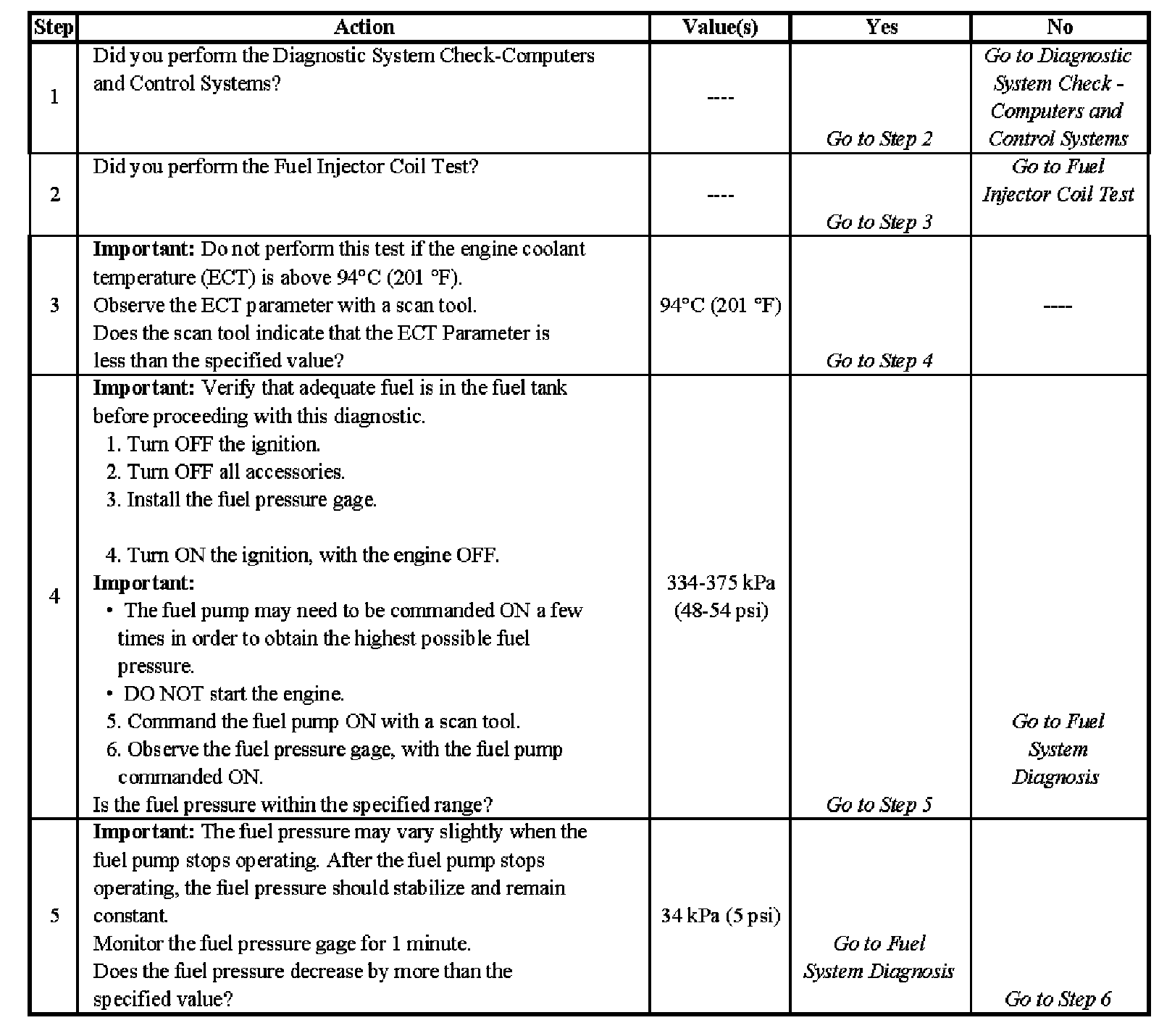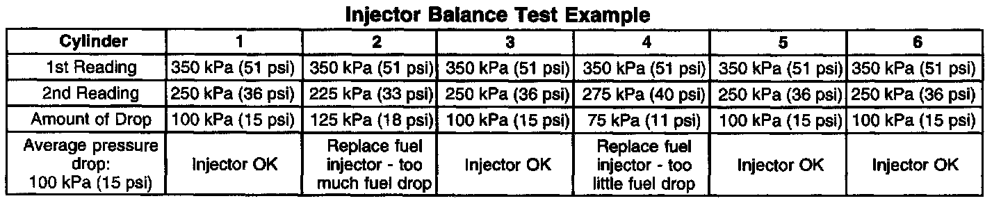 6. If the pressure drop value for each fuel injector is within 10 kPa (1.5 psi) of the average pressure drop value, the fuel injectors are flowing properly. Calculate the pressure drop value for each fuel injector by subtracting the second pressure reading from the first pressure reading. Refer to the Injector Balance Test Example. Component Tests and General Diagnostics