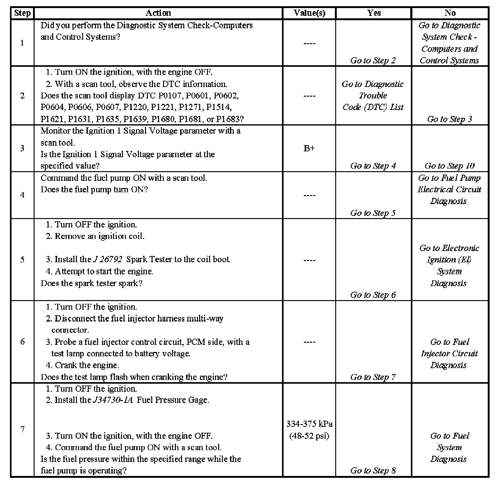 DESCRIPTIONThe Engine Cranks but Does Not Run diagnostic table is an organized approach to identifying a condition that causes an engine not to start. The Engine Cranks but Does Not Run diagnostic table directs the service technician to the appropriate system diagnosis. The Engine Cranks but Does Not Run diagnostic table assumes the following:
