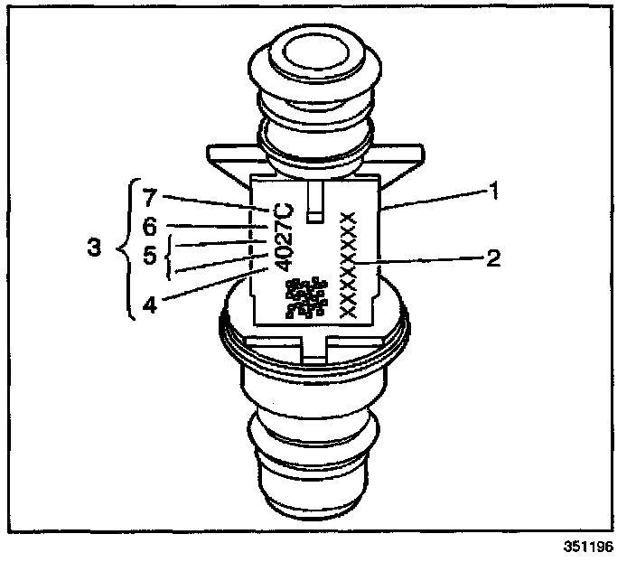 The fuel injector assembly (1) is stamped with a part number identification (2). A tour digit build date code (3) indicates the month (4), day (5), year (6), and the shift (7) that built the injector.