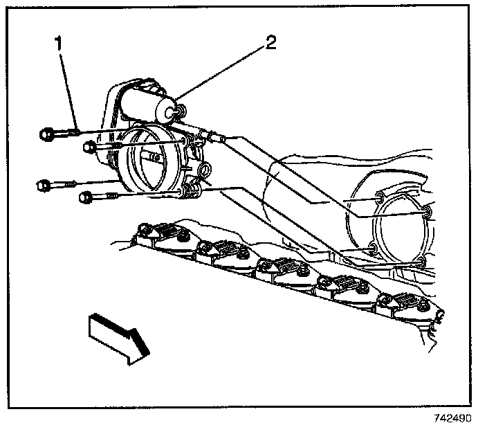 5. Remove the throttle body assembly (2) and the gasket from the intake manifold.