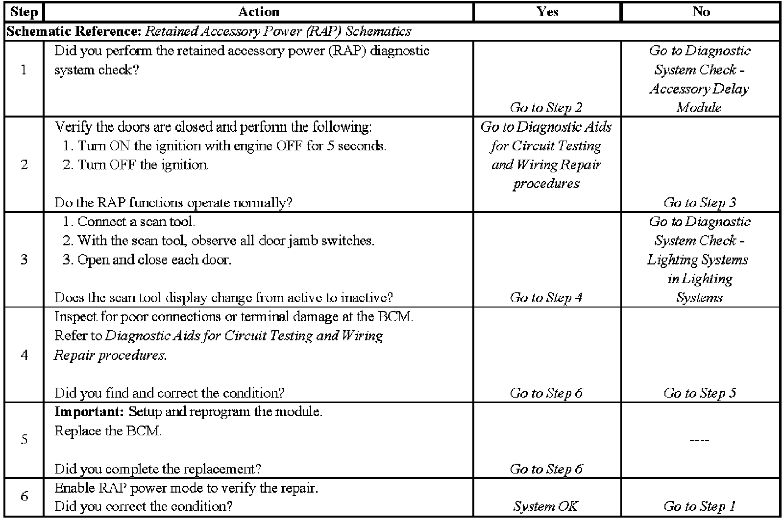 Retained Accessory Power (RAP) Inoperative (No Relay Class 2) - Steps 1-6: