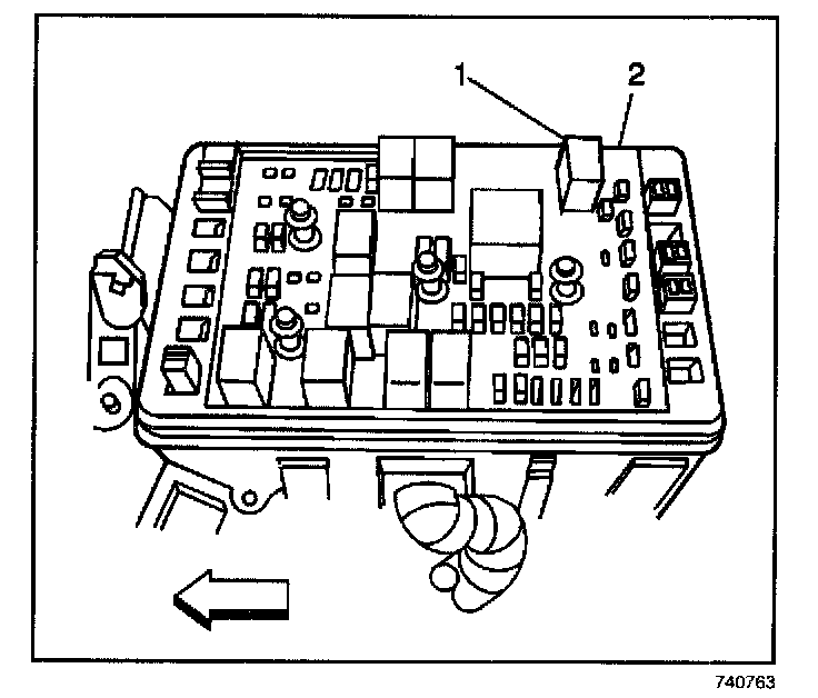 2. Remove the compressor relay (1) from the underhood fuse block (2).