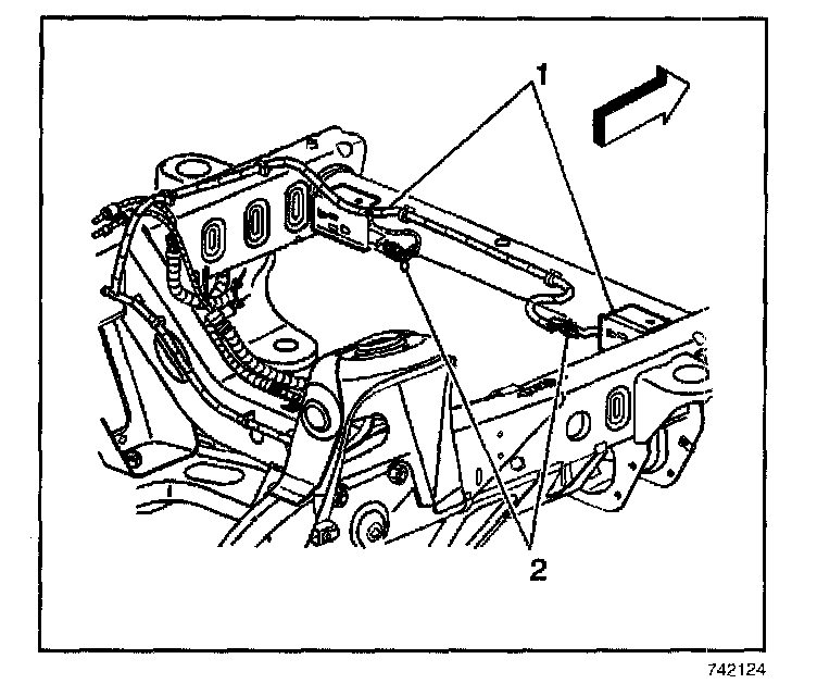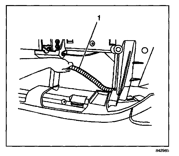 4. Raise and support the headlamp wire harness (1) to gain access to the front end discriminating sensor.
