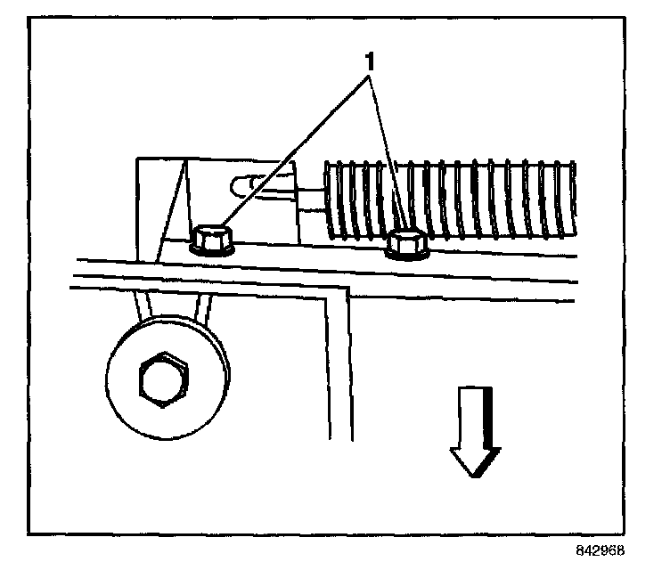 6. Install the 2 bolts (1) retaining the discriminating sensor assembly to the frame.
