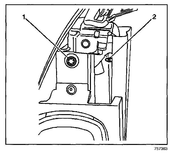 6. Remove the push pin (2) securing the top of the seat belt retractor assembly to the seat back frame.