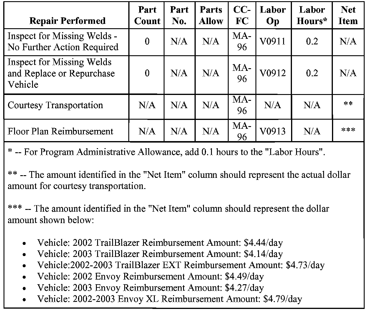 Dealers in possession of vehicles included in the Stop Delivery are eligible for reimbursement of floor plan expense upon completion of this recall. This reimbursement is limited to the number of days from the Stop Delivery message to receipt of the recall parts and/or repair procedures. Floor plan reimbursement beyond these dates is not allowed. The amount of reimbursement should be charged as a net amount expense using the recall labor operation provided.