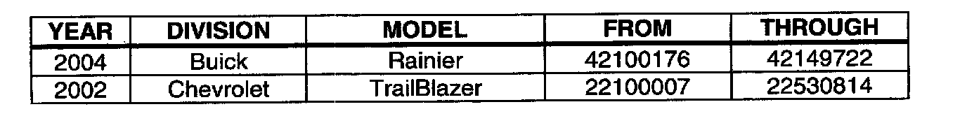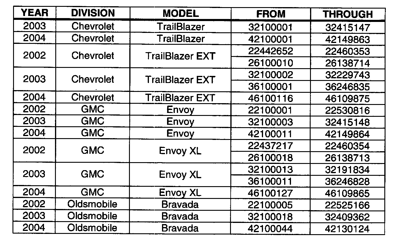 Involved are certain 2002-2004 model year Chevrolet TrailBlazer and TrailBlazer EXT, GMC Envoy and Envoy XL, Oldsmobile Bravada vehicles, and 2004 model year Buick Rainier vehicles built within the VIN breakpoints shown.