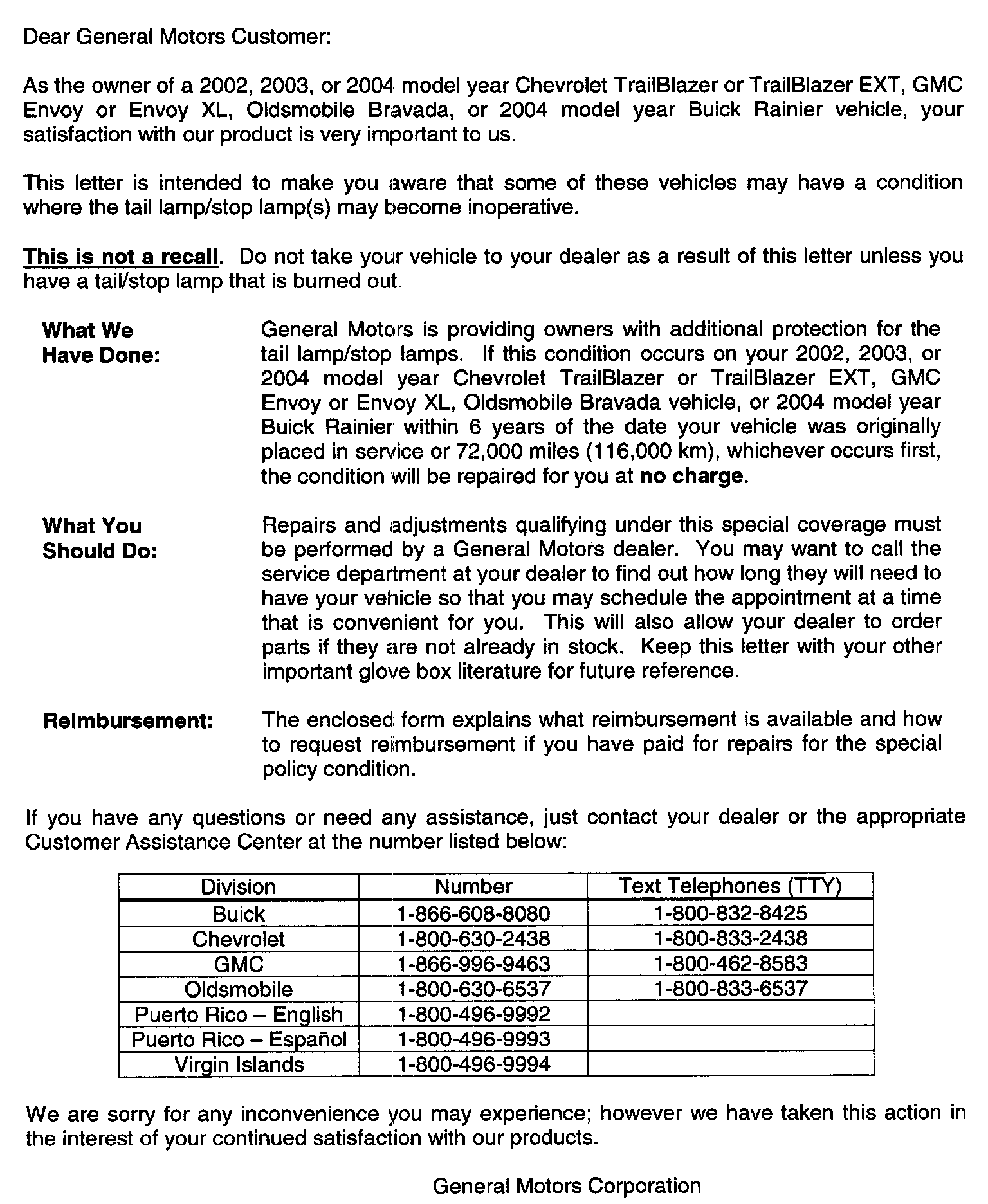 General Motors will notify customers of this special policy on their vehicles (see copy of typical customer letter included with this bulletin - actual divisional letter may vary slightly).