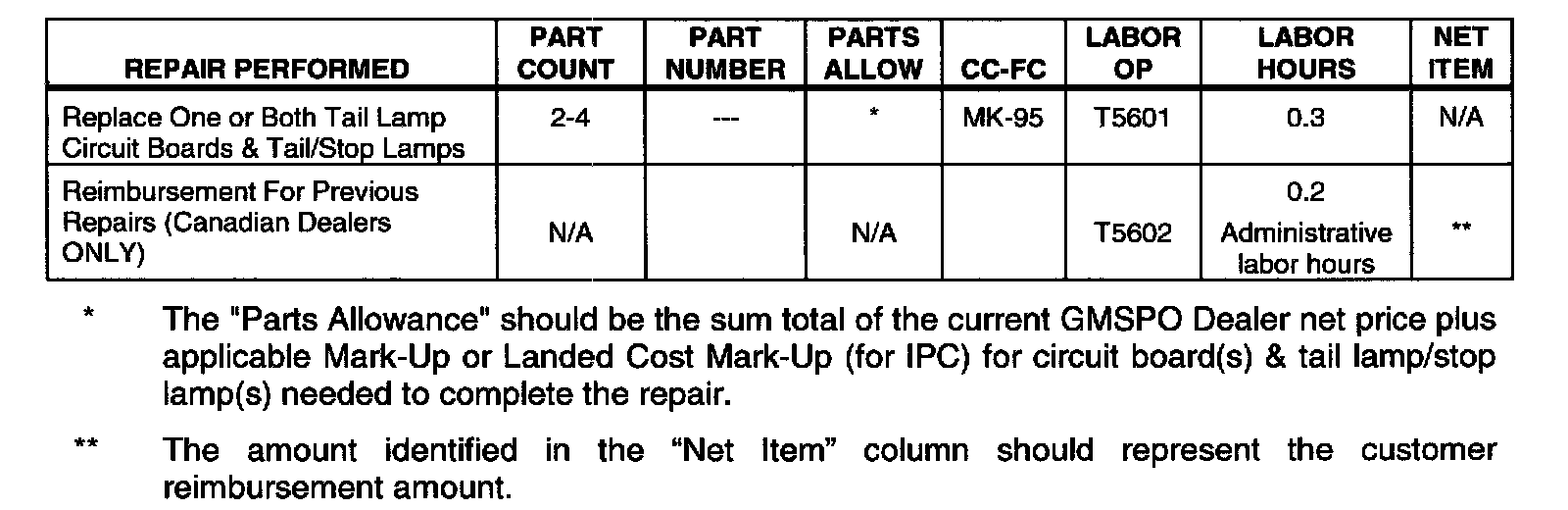 Customer requests for reimbursement of previously paid repairs to replace tail lamp circuit board(s) and tail lamp/stop lamp(s), are to be submitted prior to or by December 31, 2005. Repairs must have occurred within 6 years of the date the vehicle was originally placed in service, or 116,000 km, whichever occurs first.