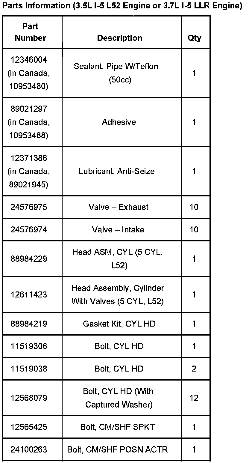Parts Information (3.5L I-5 L52 Engine or 3.7L I-5 LLR Engine)