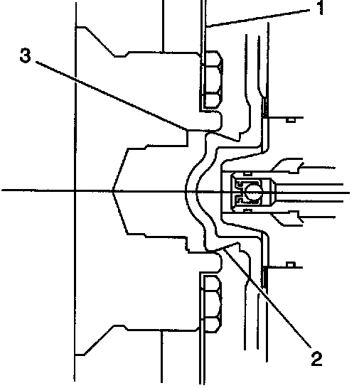 3. Align the torque converter hub (2) in the engine crankshaft (3) and install the torque converter to flywheel bolts.