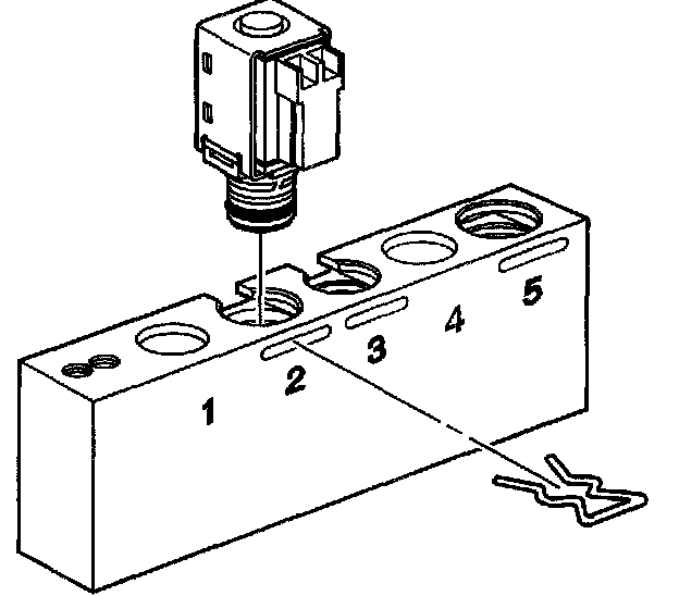 2. Install the TCC solenoid valve, the 1-2 shift solenoid valve or the 2-3 shift solenoid valve into bore number 2 of the J 44246 and install the factory retainer clip to retain the solenoid.