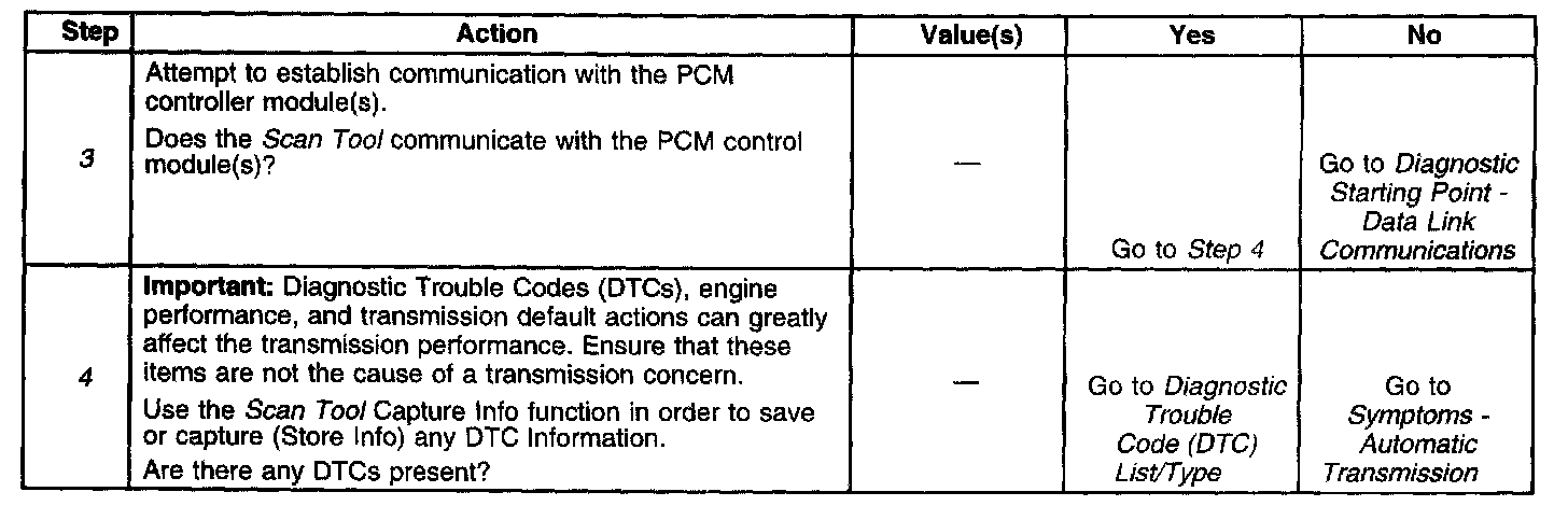 The Automatic Transmission Diagnostic System Check is an organized approach to identify a problem created by an automatic transmission. The Diagnostic System Check is the diagnostic starting point for an automatic transmission complaint. The Diagnostic System Check directs you to the next logical step for diagnosing a transmission concern. Perform this check only if there is a driveability complaint or if you have been directed here from another service information section.
