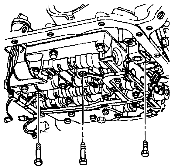 10. Remove the TCC solenoid retaining bolts and the valve body bolts which retain the internal wiring harness.