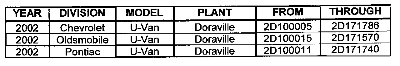 Involved are certain 2002 Chevrolet Venture, Pontiac Montana, and Oldsmobile Silhouette U-Van model vehicles equipped with AWD RPO and built within the VIN breakpoints shown.