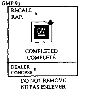 Put the Recall Identification Label on a clean and dry surface of the radiator core support in an area that will be visible to people servicing the vehicle. Additional Recall Identification Labels for Canadian dealers can be obtained from DGN by calling 1-800-668-5539 (Monday-Friday, 8:00 a.m. to 5:00 p.m. EST). Ask for Item Number GMP 91 when ordering.