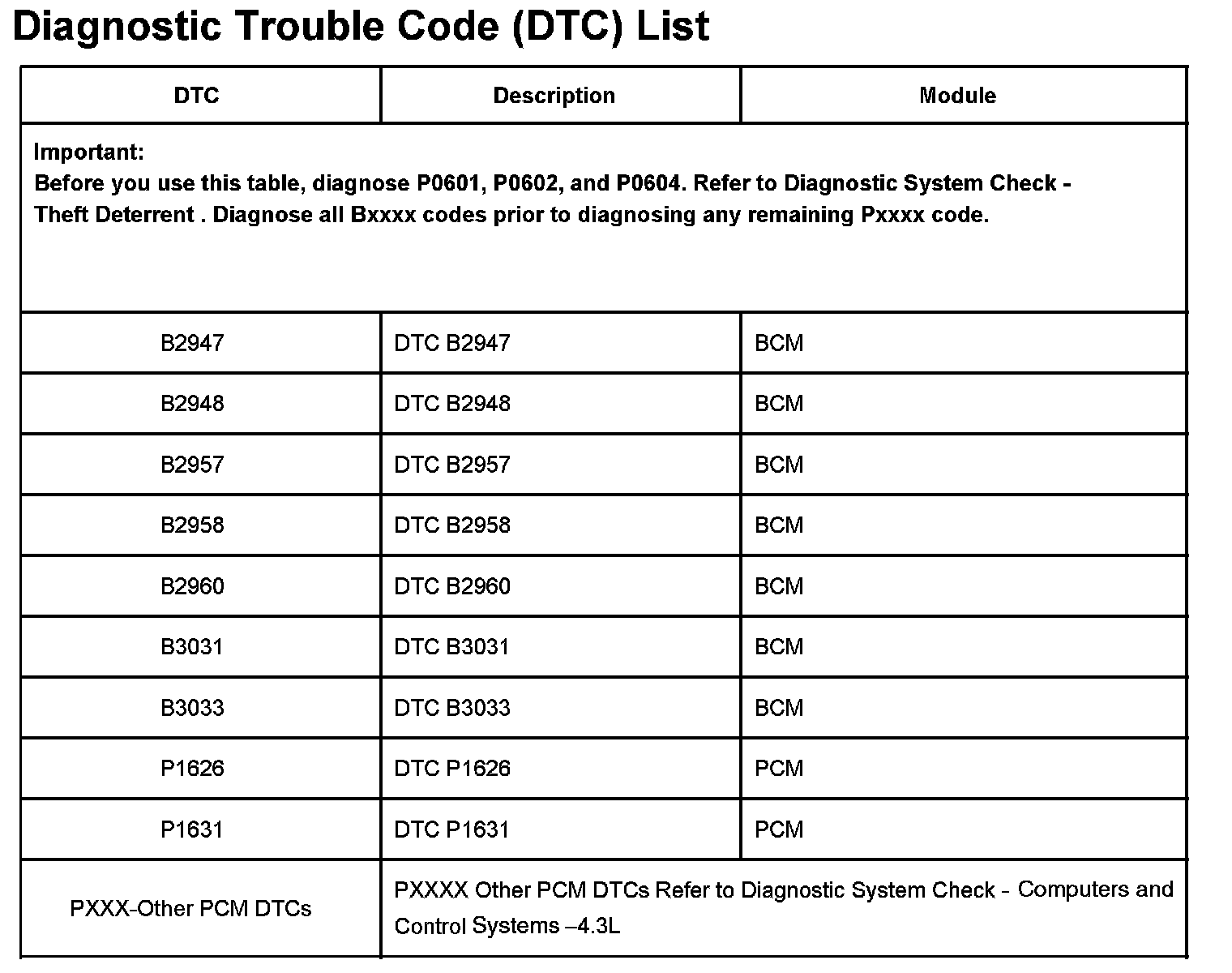 DTCs B2947 - P1631: